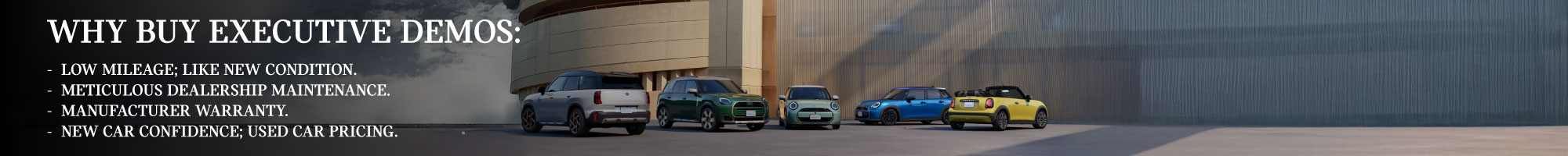 What is an Executive Demo Vehicle? An Executive Demo is a MINI that has been driven by dealership staff or used as a service loaner, but has never been sold or titled to a retail customer. Typically driven fewer than 5,000 miles, these vehicles are meticulously maintained by our factory-trained MINI technicians, ensuring they remain in pristine, like-new condition.